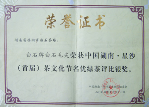 白石牌白石毛尖榮獲中國湖南·星沙(首屆)茶文化節(jié)名優(yōu)綠茶評(píng)比銀獎(jiǎng)